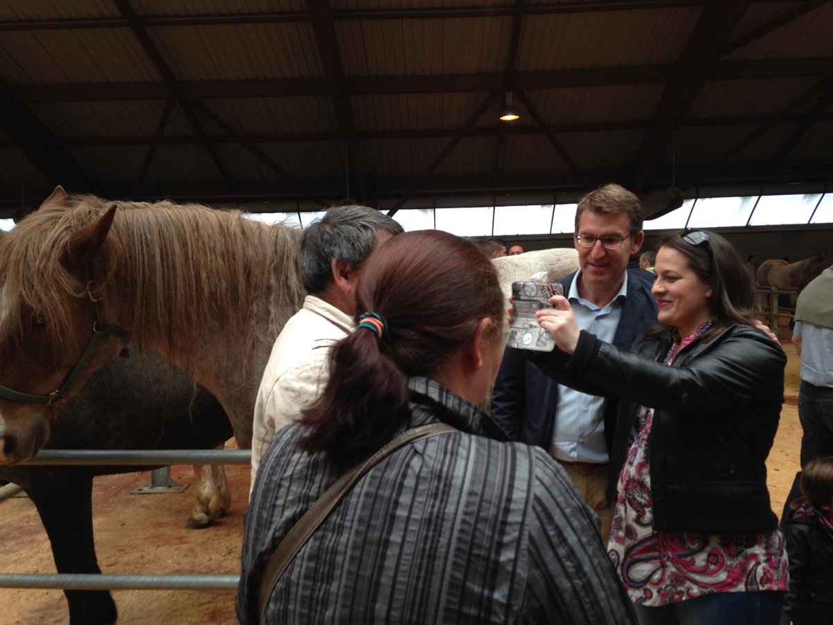 En su recorrido hubo incluso una 'fan' que, móvil en mano, le pidió una imagen juntos a gritos de "¡guapo, guapo!". Entre fotografías y apretones de mano, tan característicos de la etapa preelectoral, Feijóo ha llegado a la nave en la que estaban los caballos.