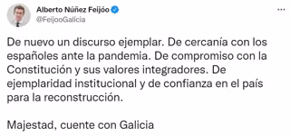 A través de su cuenta de Twitter, el mandatario gallego ha destacado la "cercanía con los españoles ante la pandemia" que mostró el monarca en su intervención, así como el "compromiso con la Constitución y sus valores integradores".