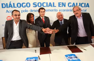 En la firma del acuerdo marco del diálogo social junto a responsables de la Confederación de Empresarios de Galicia (CEG), UGT, CC.OO. y del Gobierno autonómico, el jefe del Ejecutivo gallego ha calificado de "completo" este pacto al sostener que "cultiva" la unidad en las "áreas clave" para lograr una comunidad "fuerte y próspera".
