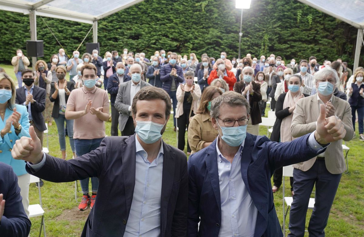 (I-D) El líder del PP de Galicia, Alberto Núñez Feijóo; y el presidente del PP, Pablo Casado, durante la presentación de candidaturas del Partido Popular en Galicia para los comicios gallegos del 12 de julio, en Santiago de Compostela, Galicia. - Álvaro Ballesteros - Europa Press