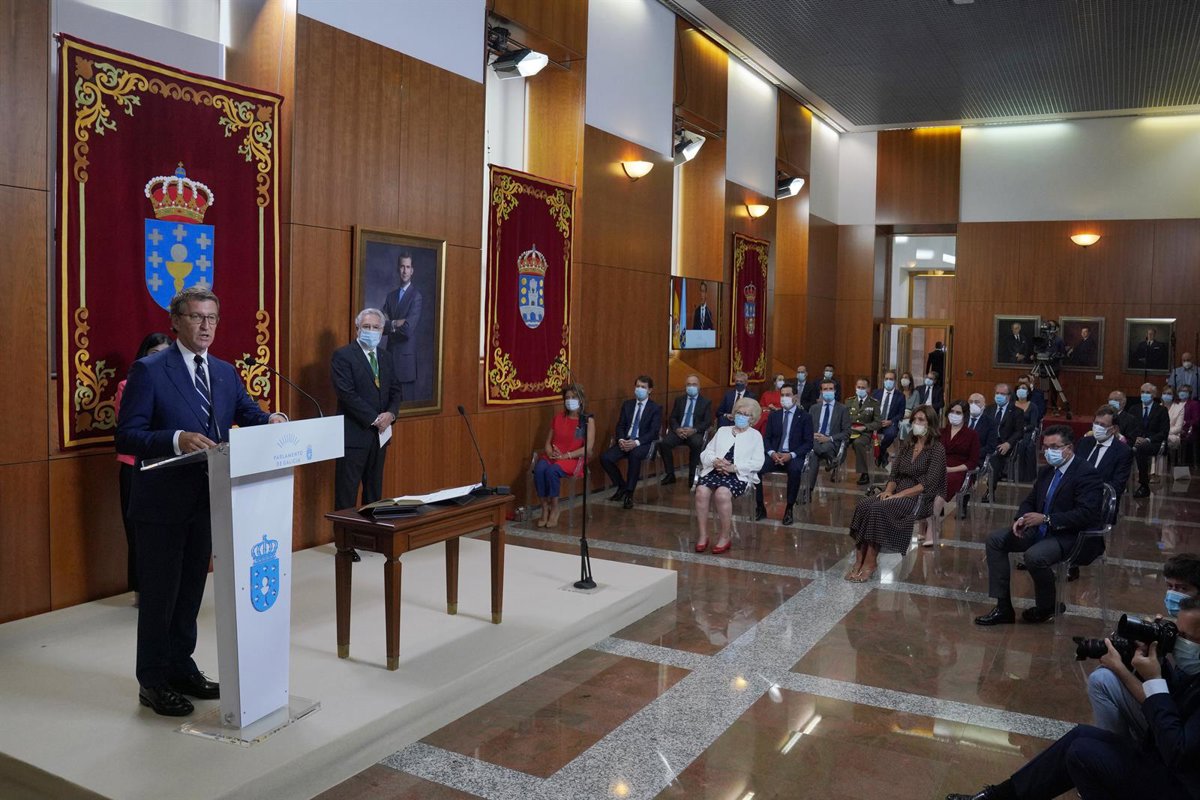 La pandemia del coronavirus no ha marcado solamente la mayor parte de su intervención --en la que ha tenido palabras para las 656 víctimas mortales en la Comunidad--, sino también la organización de un acto que ha obligado a que los más de 200 invitados, principalmente autoridades civiles y políticas, tuviesen que guardar la distancia de seguridad y portar mascarilla. De hecho, las restricciones han provocado que los presentes se tuviesen que repartir por distintas salas y pasillos del Pazo do Hórreo.