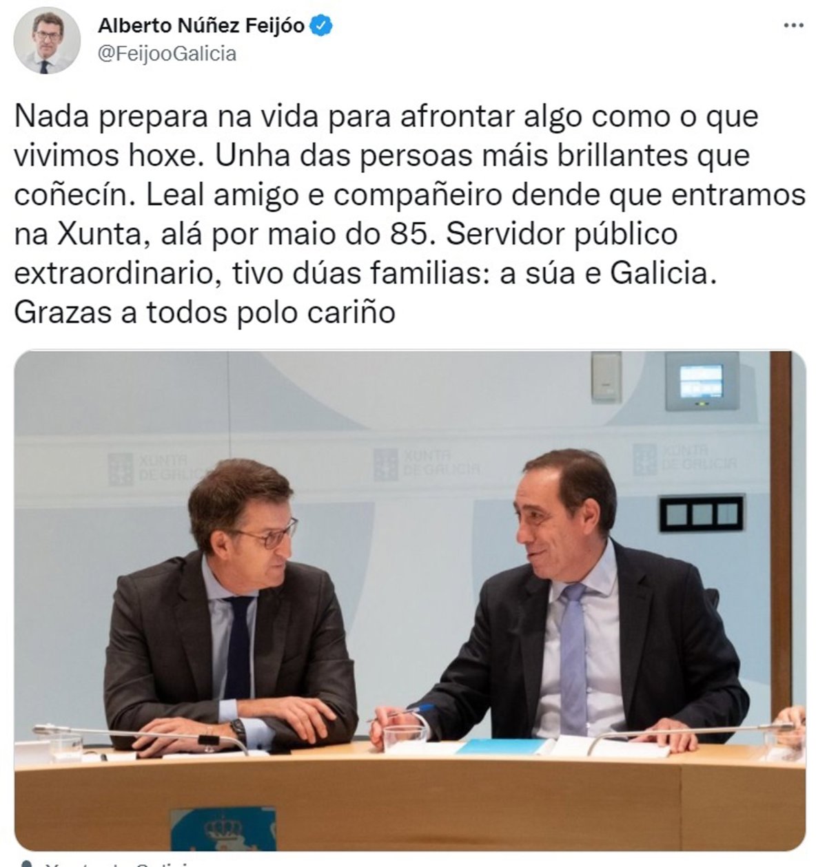 "Una de las personas más brillantes que he conocido. Leal amigo y compañero desde que entramos en la Xunta, allá por mayo del 85. Servidor público extraordinario, tuvo dos familias: la suya y Galicia. Gracias a todos por el cariño", señala el texto publicado en gallego.