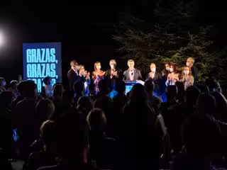 El presidente de la Xunta y candidato a la reelección por el PP, Alberto Núñez Feijóo, junto a varios conselleiros y miembros del partido en la noche electoral. - César Arxina - Europa Press