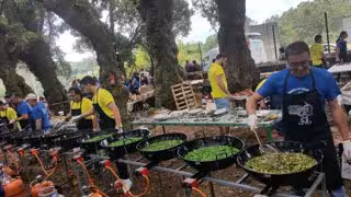 De vuelta al recinto ferial, alrededor de las 13,30 horas los miembros de la comisión han comenzado con la elaboración de los "más de 800 kilos" de pimientos en una quincena de sartenes, a la vez que el trío Unión y Fuerza amenizaba la comida con su música.