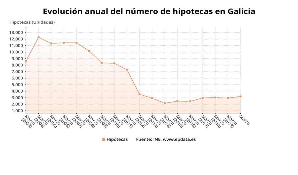 Evolución del número de hipotecas firmadas para viviendas en Galicia hasta marzo de 2020 (INE) - EPDATA