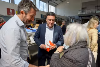 El secretario xeral del PSdeG, Valentín González Formoso, en una visita a la plaza de abastos de Vilagarcía de Arousa (Pontevedra) junto con el alcalde y candidato a la reelección, Alberto Varela. - PSDEG