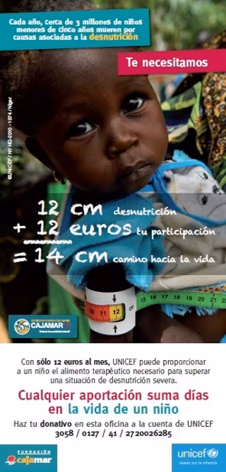 Con 12 euros por niño, Unicef puede ofrecer el alimento terapéutico y las condiciones necesarias para que un niño supere la barrera de los 12,5 centímetros. Cualquier cantidad suma para lograrlo, añaden.