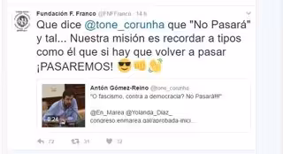 "Que di @tone_corunha (o nome de Twitter de Gómez-Reino) que "Non Pasará" e tal... A nosa misión é lembrar a tipos como el que se hai que volver pasar PASAREMOS!", contestoulle a Fundación nunha mensaxe recollida por Europa Press, e que ilustran cun emoticono con lentes de sol, un dun puño e outro dunha man saudando.