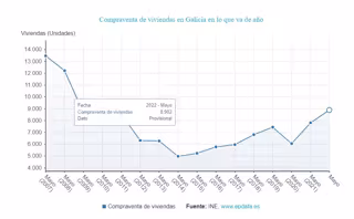 La comunidad gallega registra 8.902 compraventas de viviendas en los cinco primeros meses del año, lo que supone la mayor cifra desde 2010, cuando se pasaba de 9.000 operaciones.