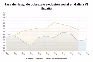 De este modo, la tasa de riesgo de pobreza o exclusión social (AROPE, por sus siglas en inglés) es del 23% en Galicia en 2018, frente al 26,1% de la media. El riesgo de pobreza, por su parte, alcanza el 18,8% en la comunidad, frente al 21,5% del conjunto estatal.