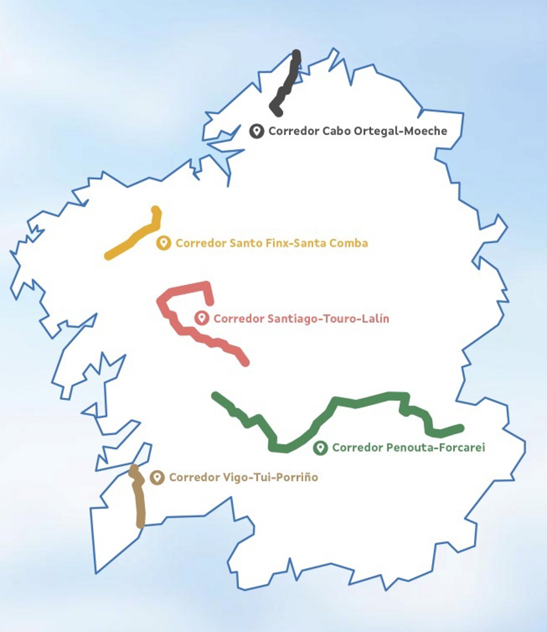 Los corredores son Santiago-Touro-Lalín, con cobre, cobalto, zinc, galio, germanio, indio; Cabo Ortegal-Moeche, con cromo y elementos del grupo del platino; Penouta-Forcarei, con tantalio, niobio, litio, estaño; San Finx-Santa Comba, con wolframio, estaño y bismuto y Vigo-Tui-Porriño, con tierras raras.