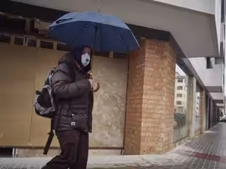 Un hombre con mascarilla camina protegiéndose con un paraguas por la lluvia durante el Martes Santo y la cuarta semana del estado de alarma decretado por el Gobierno por la crisis del coronavirus, en Pamplona/Navarra (España) a 7 de abril de 2020. - Eduardo Sanz - Europa Press