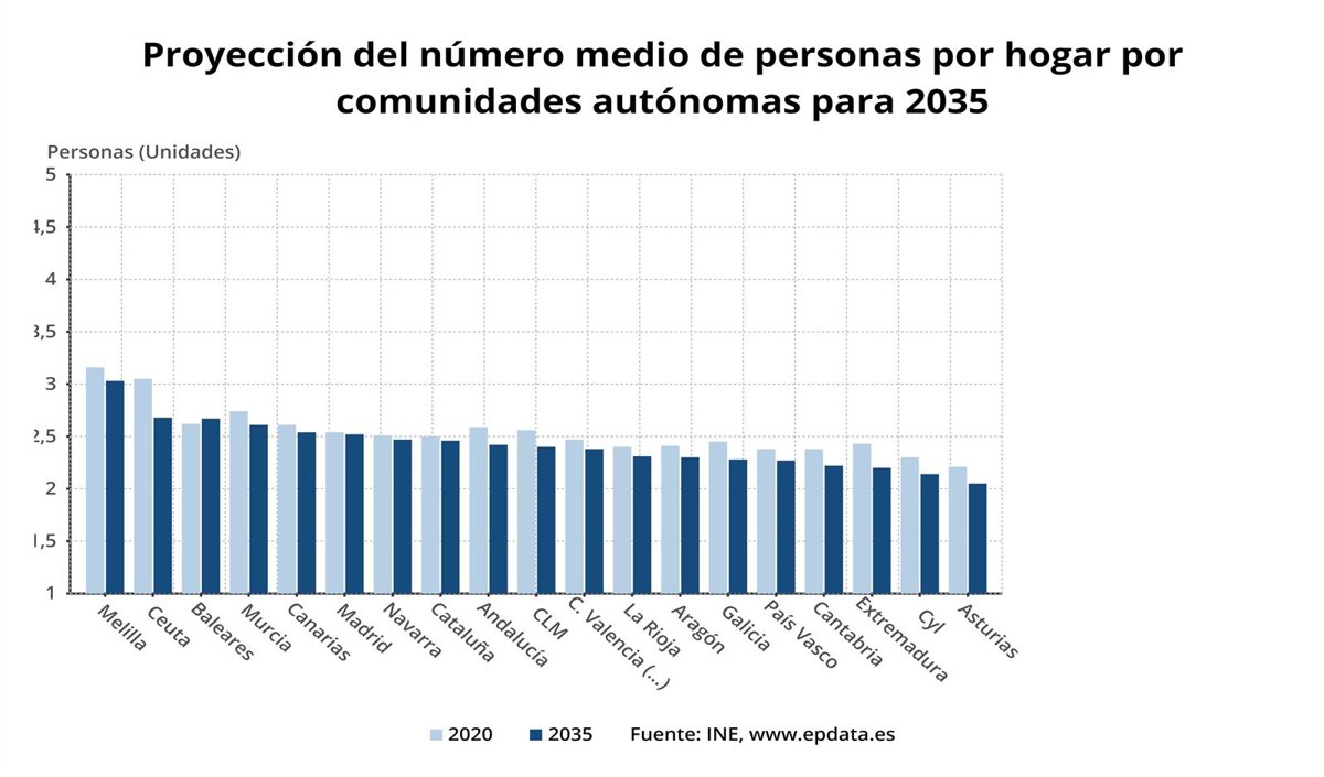 El tamaño medio del hogar disminuiría en todas las comunidades, salvo en Baleares. Los mayores descensos se registrarían en Extremadura, Principado de Asturias y Castilla y León. Por su parte, los descensos más moderados se darían en Comunidad de Madrid, Cataluña y Comunidad Foral de Navarra.