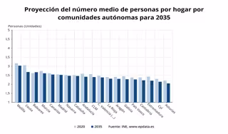 El tamaño medio del hogar se reduciría, de cumplirse esta proyección, de 2,45 a 2,28 personas, mientras que el porcentaje de hogares unipersonales aumentaría, del 26,1% al 30,4%.