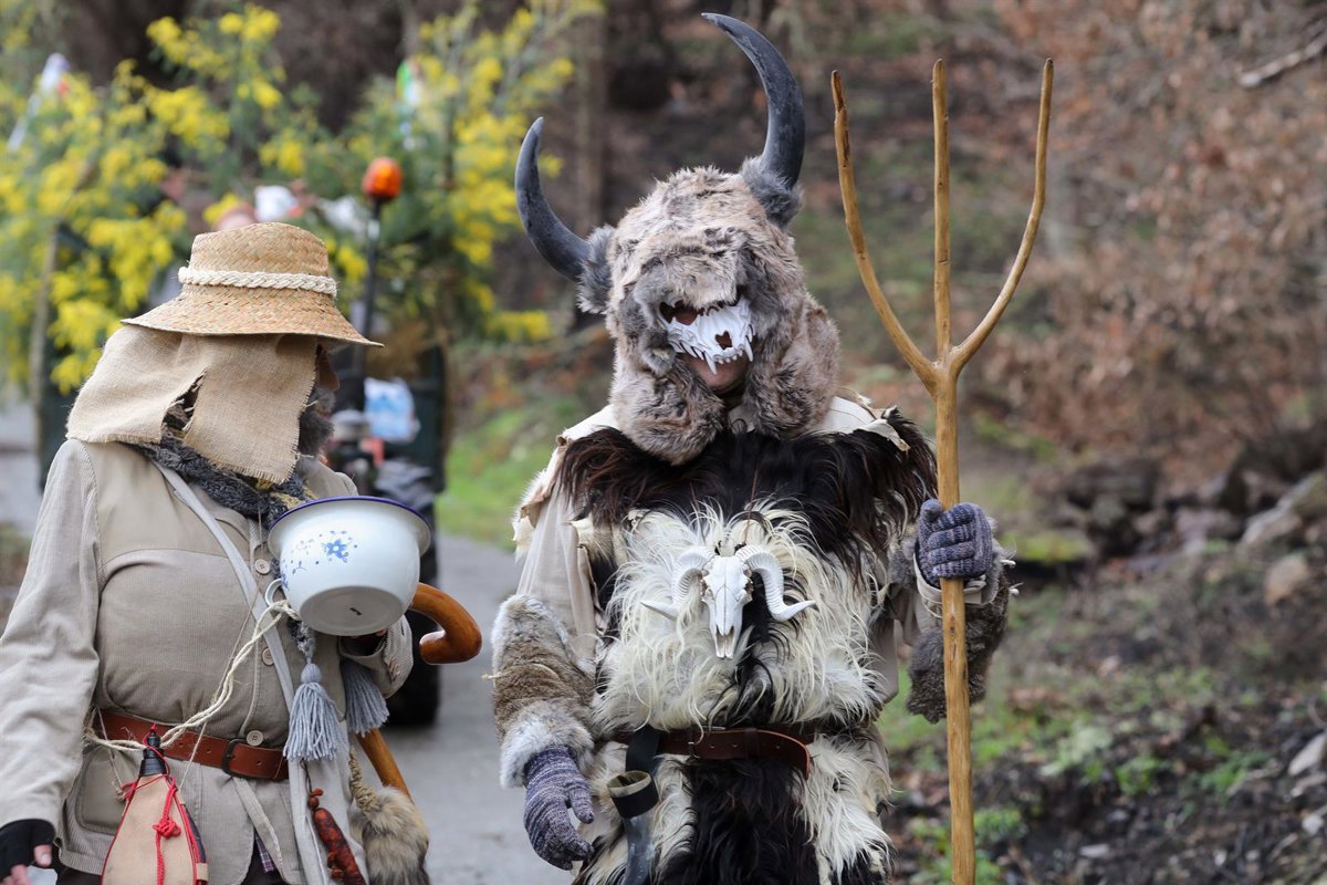 En Ourense, los peliqueiros de Laza se han estrenado en un domingo cargado de visitantes. Las calles de la localidad han recibido a esta figura, cuya indumentaria se basa en una máscara de madera, chaqueta con flecos, cencerros y una fusta.