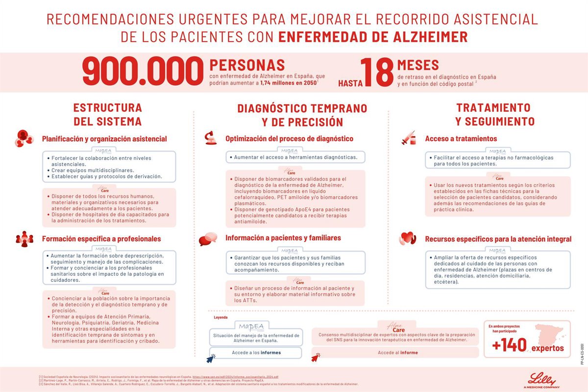 De las más de 40 recomendaciones elaboradas por un grupo de 50 expertos de diferentes especialidades, 14 de ellas se identifican como prioritarias. Según la doctora Raquel Sánchez-Valle, neuróloga en el Hospital Clínic de Barcelona y coordinadora del Grupo de estudio de conducta y demencias de la Sociedad Española de Neurología, "urge establecer circuitos ágiles de derivación entre niveles asistenciales y disponer de las herramientas adecuadas, incluyendo biomarcadores".