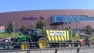 Cientos de ganaderos bloquean con sus tractores en la mañana de este martes los accesos al área comercial de As Cancelas, en donde se encuentra el supermercado Carrefour, al que acusan de vender leche como producto reclamo, así como el centro logístico de DIA situado en el polígono del Tambre.