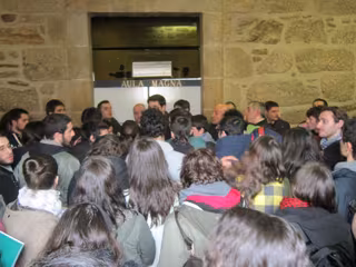 Expuestos estos argumentos, este estudiante volvió a situarse junto a sus compañeros, que prosiguieron con sus cánticos pidiendo 'Fóra fascistas da USC' ('Fuera fascistas de la USC') entre reproches del resto de asistentes a la conferencia.