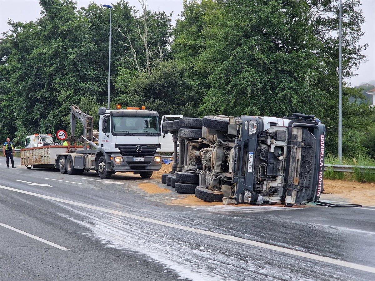 El conductor de un camión ha resultado herido este jueves al volcar con el vehículo en el que transportaba arena en la parroquia de Valadares, en Vigo. Al esparcirse la carga por la carretera, se produjeron fuertes retenciones mientras duraban las labores de limpieza.