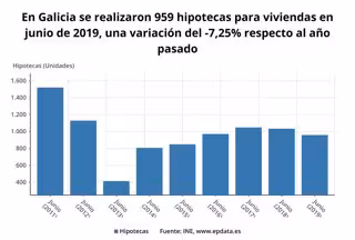 El número de hipotecas constituidas sobre viviendas inscritas en los registros de la propiedad se situó en 959 en junio en Galicia, cifra un 7,3% inferior a la del mismo mes de 2018, según los datos que publica este viernes el Instituto Nacional de Estadística (INE), que recuerda que los datos de esta estadística proceden de escrituras públicas realizadas anteriormente.