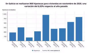 El número de hipotecas constituidas sobre viviendas inscritas en los registros de la propiedad se situó en 968 el pasado mes de noviembre en Galicia, lo que supone un incremento del 6% respecto al mismo mes de 2019, frente al descenso de la media, según los datos que publica este miércoles el Instituto Nacional de Estadística (INE).