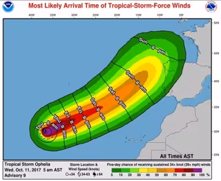 En la misma línea, fuentes de MeteoGalicia han señalado a Europa Press, que la previsión es que 'Ophelia' se mueva hacia la península el viernes y el sábado y, aunque puede ganar algo de fuerza en su recorrido, el domingo ya comenzaría a perderla, coincidiendo con su llegada a Galicia.