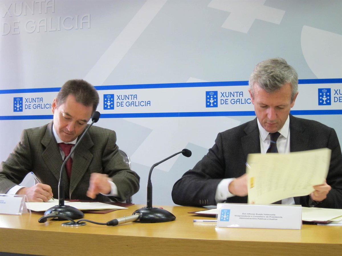 El vicepresidente de la Xunta, Alfonso Rueda, y el vocal de Consejo General del Poder Judicial (CGPJ) Manuel Almenar han firmado este viernes el convenio de colaboración por el cual este sistema podrá ponerse en marcha "a partir de ya", después de que la Administración autonómica dotase los órganos judiciales gallegos de las tecnologías necesarias para la normalización del sistema.