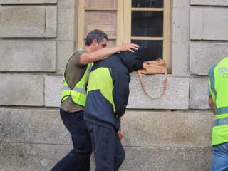 El dueño de la pirotecnia La Gallega, que fue detenido pocas horas después de la explosión en la zona cero de la tragedia, llegó poco antes de las 11 horas a los juzgados de Tui, escoltado por dos agentes de la Guardia Civil y con la cabeza tapada por una capucha.