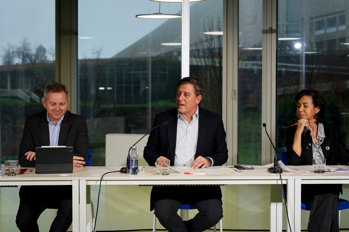 El exministro de Sanidad, José Miñones; el candidato a la Presidencia de la Xunta, José Ramón Gómez Besteiro; y la exsecretaria de Estado Isabel Pardo de Vera este martes en la Cidade da Cultura de Santiago - PSDEG