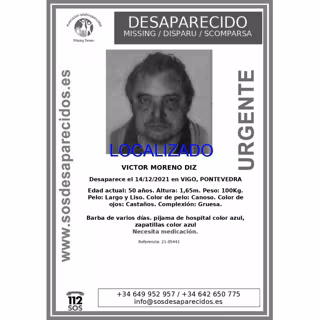 El hombre de 50 años de edad, Víctor Moreno Díaz, cuya desaparición en Vigo fue denunciada este martes, ha sido localizado y reingresado al Hospital Álvaro Cunqueiro, según han informado fuentes policiales.