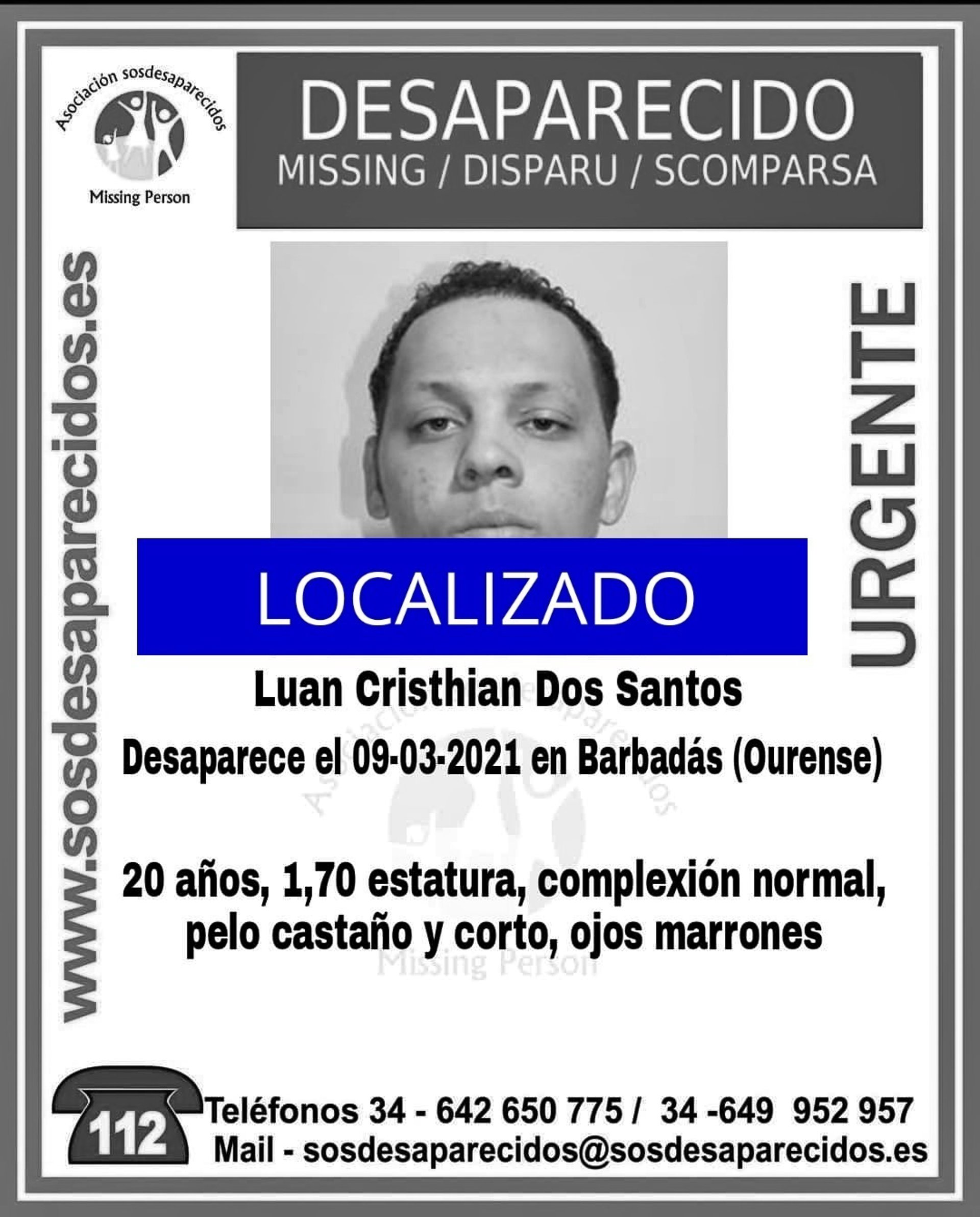 SOS Desaparecidos ha desactivado este domingo la búsqueda de Luan Christian dos Santos, el joven de 20 años que llevaba más de un mes desaparecido en Barbadás (Ourense), porque ya ha sido localizado.