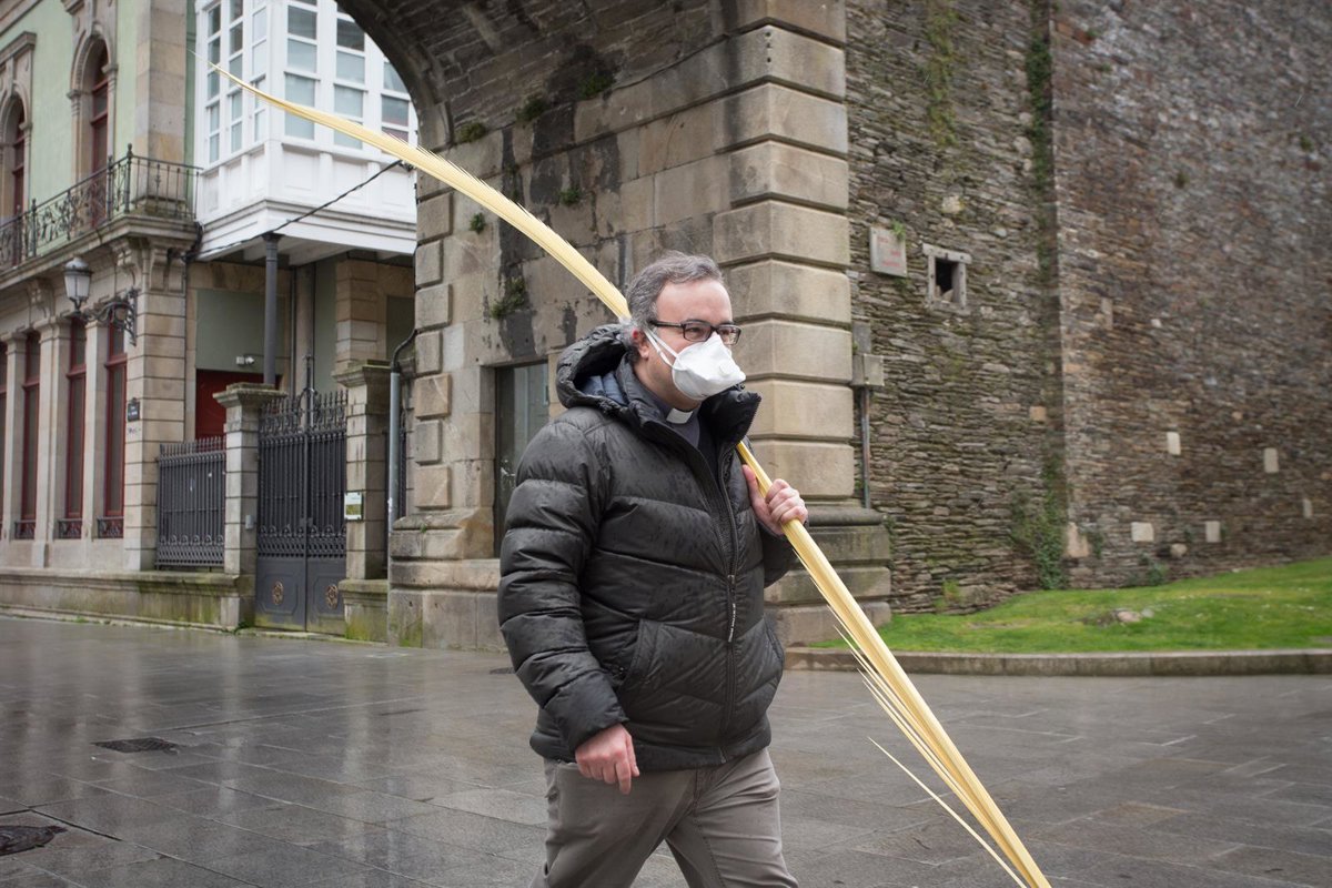 Un cura camina con una palma bendecida durante el Domingo de Ramos en Lugo tras la suspensión de la Semana Santa por el estado de alarma del coronavirus, en Lugo/Galicia (España) a 5 de abril de 2020 - Carlos Castro - Europa Press
