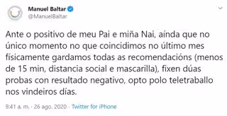 "Ante el positivo de mi padre y mi madre, aunque en el único momento en el que coincidimos en el último mes físicamente guardamos todas las recomendaciones (menos de 15 minutos, distancia social y mascarilla), hice dos pruebas con resultado negativo, opto por el teletrabajo en los próximos días", apunta el mensaje.