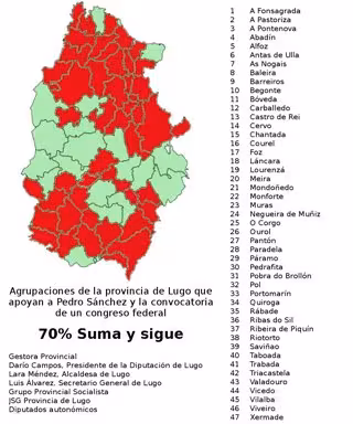 La gestora que dirige el PSOE en la provincia de Lugo se ha puesto en contacto este sábado con los lucenses con asiento en el Comité Federal para dejarles constancia de que más del 70 por ciento de las agrupaciones locales apoyan a Pedro Sánchez como secretario general y demandan unas primarias y un congreso extraordinario para solucionar la situación generada.