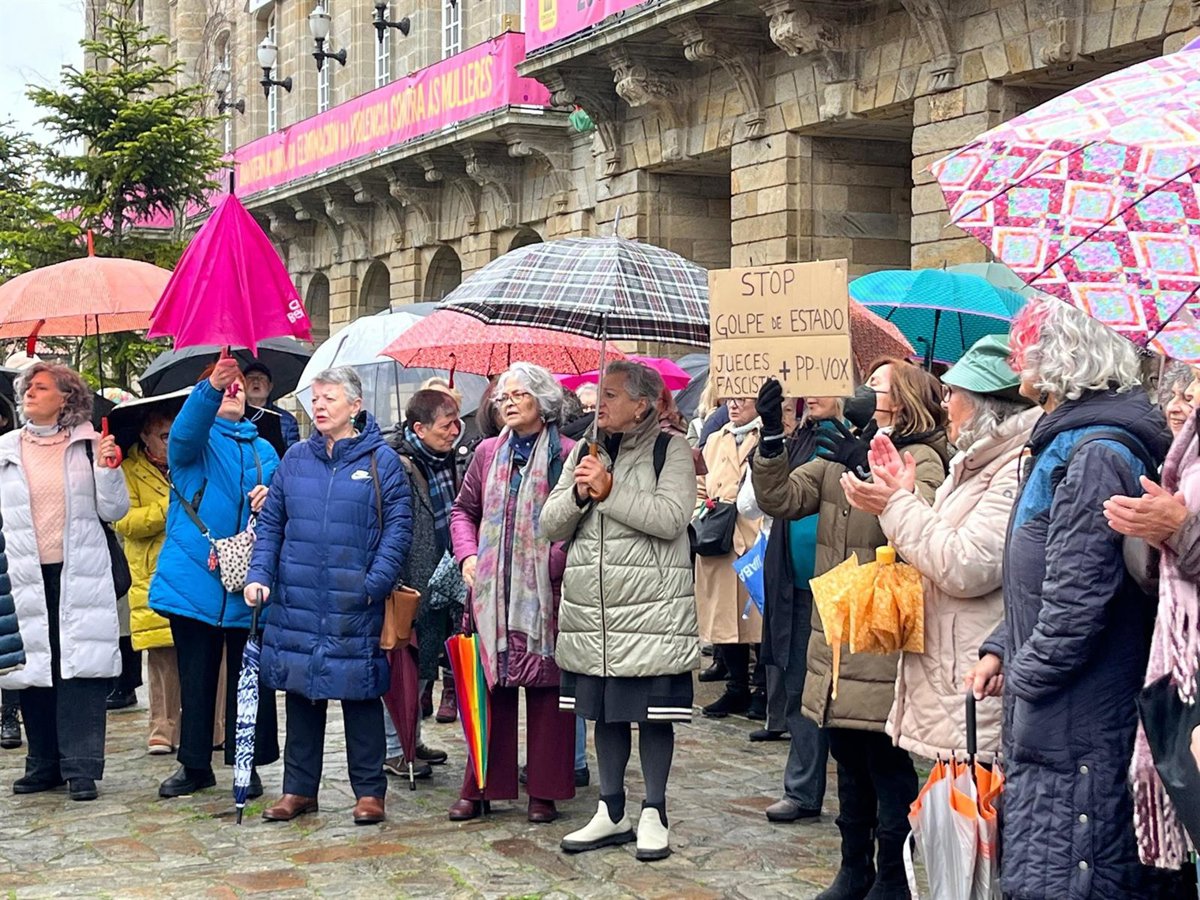 'Na xustiza non ao golpe de Estado', 'Tribunal Supremo dimisión', 'Se é fascista, non é xustiza', 'Renovación do poder xudicial' y 'Álvaro, amigo, Santiago está contigo' son alguna de las frases que se han entonado frente a la Praza do Obradoiro como muestra de apoyo a García Ortiz.