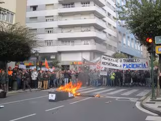 Una vez ante el Parlamento prendieron fuego al féretro y a las figuras, que ardieron entre gritos de protesta de los operarios, que llevaban pancartas con lemas como 'Remátase o traballo, remátase a paciencia' o 'Carga de traballo para Navantia, xa. Polo futuro da comarca' y lanzaron varios petardos. La protesta estuvo vigilada por un amplio dispositivo de agentes antidisturbios, que vallaron la zona.