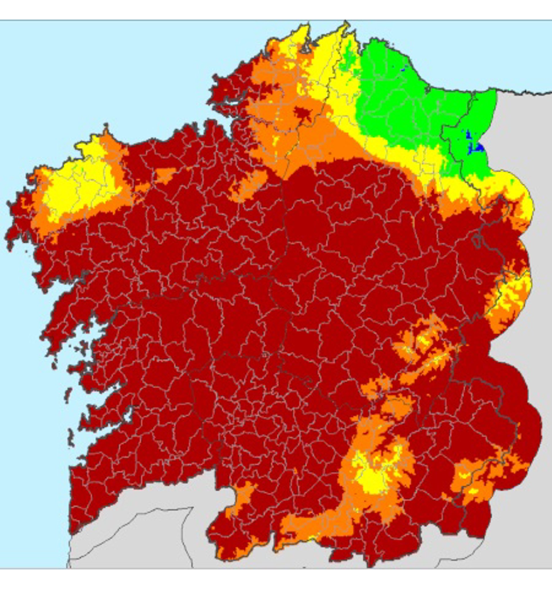 Así figura en el índice de riesgo diario de incendio forestal, que actualiza el peligro existente en Galicia cada día. Toda la provincia de Pontevedra, así como casi toda la de A Coruña (excepto una zona de la Costa da Morte que está en alto peligro) y Pontevedra están en riesgo extremo, al igual que la mitad sur de Lugo.