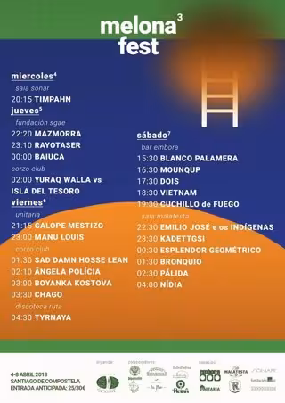 Los organizadores, el colectivo La Melona, que revitaliza desde hace más de dos años la escena cultural compostelana, han anunciado ya la distribución por escenarios y los horarios.