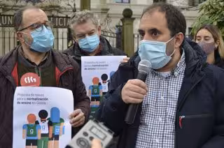 El portavoz de A Mesa, Marcos Maceira, participó en un acto ante la Consellería de Educación en Santiago de Compostela junto con representantes de la Asociación Socio-Pedagóxica Galega (AS-PG), Nova Escola Galega (NEG), Confederación de Anpas Galegas, CIG Ensino, CSIF- Ensino o STEG, impulsores de la propuesta de bases para la normalización del gallego en el sistema educativo.
