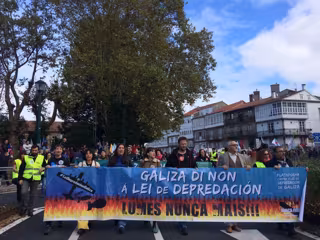 Bajo el lema 'Lumes Nunca Máis' la marcha ha sido convocada por la 'Plataforma contra a Lei de Depredación de Galicia', que ha decidido vincular la manifestación, que inicialmente protestaba contra la Ley de Feomnte de Iniciativas Empresariales de la Xunta, con los incendios después de la ola de esta semana.