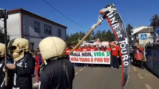 La protesta, iniciada a las 12,00, ha dejado imágenes de disfraces de esqueletos con enormes calaveras simulando la muerte y con guadañas con la frase 'Mina de Touro'; la de niños llevando ataúdes ficticios con las palabras 'R.I.P O Touro' y 'R.I.P O Pino', y decenas de tractores que denunciaban en sus carteles que "el rural no se muere, lo matan", entre cánticos constantes de 'Mina no'.