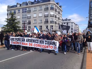 Bajo el lema 'Por un aire puro, sin arsénico ni cianuro: no a la mina de Corcoesto', los participantes en la marcha, encabeza por diversas personas de la cultura como Manuel Rivas, han rechazado este proyecto minero que afectará a tres municipios de la comarca, Cabana de Bergatiños --al que pertenece Corcoesto--, Ponteceso y Coristanco.