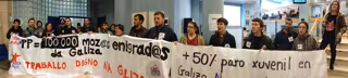 La candidata del BNG al Parlamento Europeo, Ana Miranda, acompañada de jóvenes de Galiza Nova han hecho una okupación pacífica de la oficina de empleo de Santiago de Compostela, en la que han desplegado dos pancartas y en la que han demandado "futuro con cara de joven" con trabajo frente a la "emigración" a la que, han denunciado, se ven abocados los menores de 30 años por no tener posibilidad en Galicia.