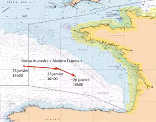 Así las cosas, el 'Modern Express' sigue en el golfo de Vizcaya con una fuerte escora y en un mar bravo. La inclinación, según la prefectura, parece estabilizada y el navío no presenta vía de agua, pero está a la deriva a una velocidad media de 1,3 nudos hacia el este.