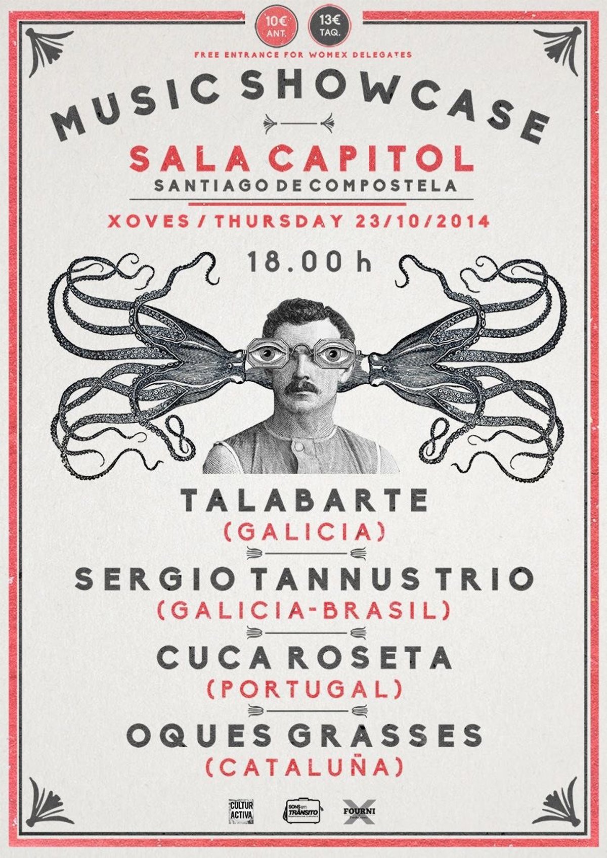 Los gallegos Talabarte, los catalanes Oques Grasses, la lusa Cuca Roseta y los brasileños Sergio Tannus Trío tocarán este jueves en Santiago de Compostela, en la Sala Capitol, aprovechando la afluencia de público y programadores a la capital gallega por la celebración de la feria profesional 'Womex' de 'world music'.