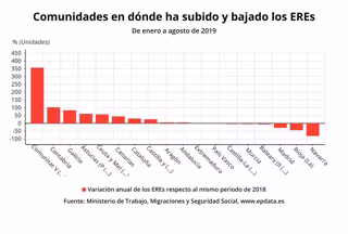 En el conjunto estatal, el dato de trabajadores afectados por ERE subió un 25% hasta agosto y sumó 49.227 afectados. Las empresas inmersas en un procedimiento de regulación de empleo disminuyeron un 0,5% entre enero y agosto, hasta un total de 1.409, en tanto que los expedientes se redujeron un 11,9%, hasta 1.866 procedimientos.