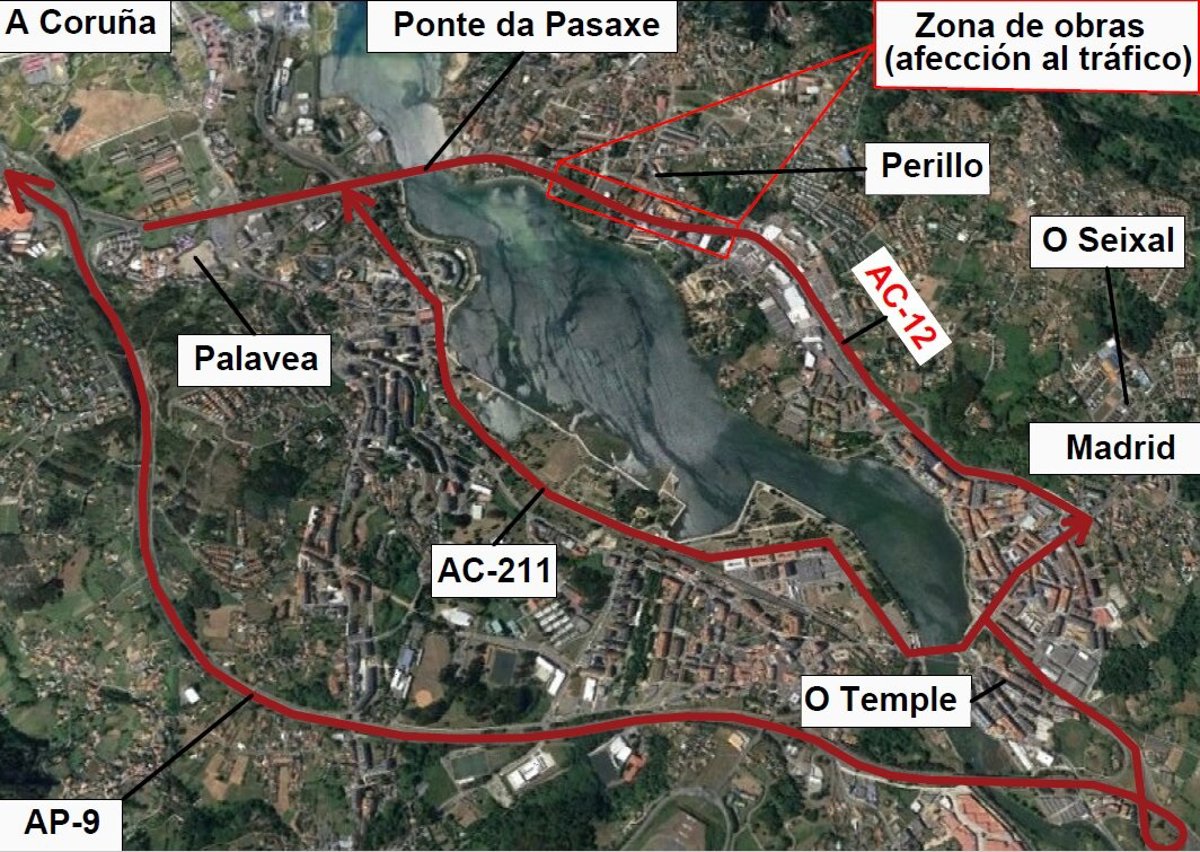 Como itinerario alternativo para evitar las obras, se recomienda la utilización de las carreteras AC-211 --entre Ponte de A Pasaxe y O Seixal-- y AP-9 --en su tramo libre de peaje entre Palavea y O Temple-- por parte de los tráficos de entrada y salida de la ciudad.