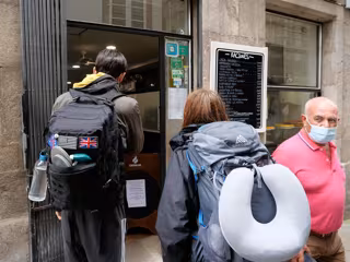 Dos peregrinos frente a un local de hostelería, a 31 de julio de 2021, en Santiago de Compostela, A Coruña (Galicia). - César Arxina - Europa Press