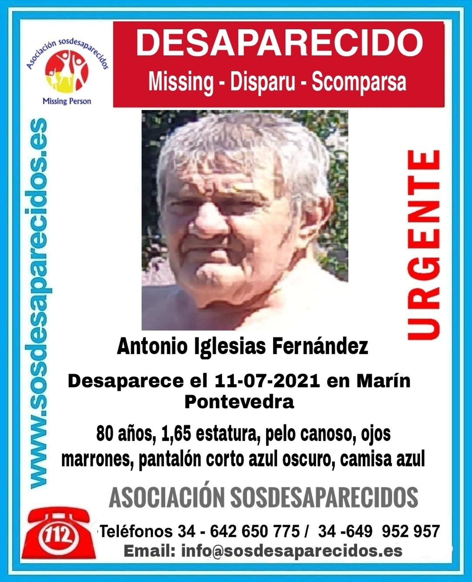 De acuerdo con el cartel difundido por SOS Desaparecidos, Antonio Iglesias Fernández mide 1,65 metros, tiene pelo canoso, ojos marrones, pantalón corto azul oscuro y camisa azul.