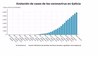 Gráfico de evolución de los casos de coronavirus en Galicia hasta el 5 de abril, según datos facilitados por el Ministerio de Sanidad. - EP DATA